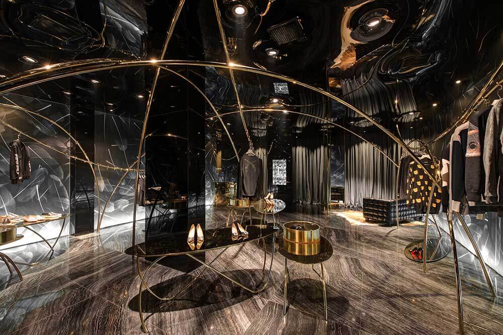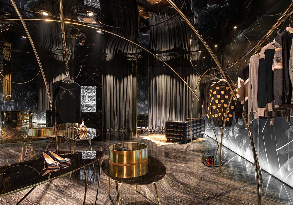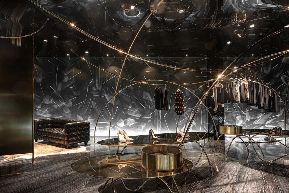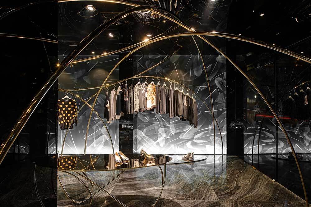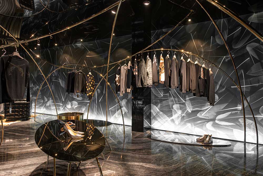海淘如鴻雁傳書(shū),聯(lián)想到鳥(niǎo),于是便將主題定為飛翔的軌跡。曲線(xiàn)是四面而來(lái)的,無(wú)定向串聯(lián)起懸掛其中的服飾。燈光是運(yùn)動(dòng)的,在服裝上騰挪,形成動(dòng)態(tài)的耀眼光斑。我們將雕塑藝術(shù)引入道具設(shè)計(jì),讓所謂潮流不停流于表像層面。流行也好,時(shí)尚也罷,并無(wú)定勢(shì)如曇花一現(xiàn)。單純從三維考慮空間,難免被禁錮,這一次,我們嘗試用靜態(tài)詮釋動(dòng)態(tài),若深層解讀,記錄的是時(shí)間。