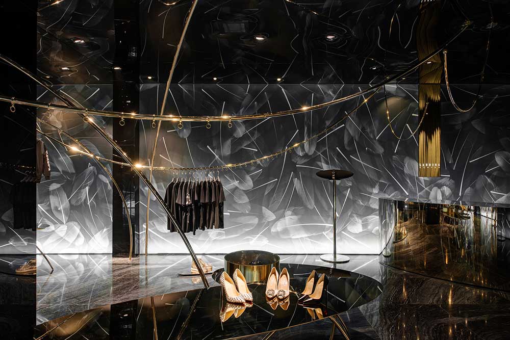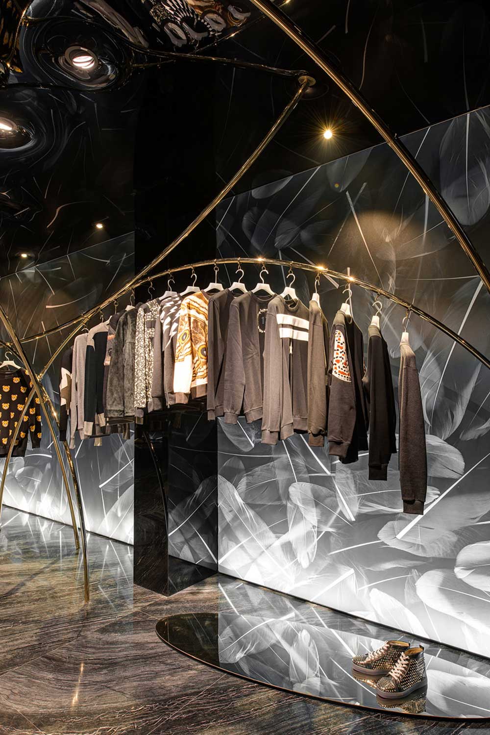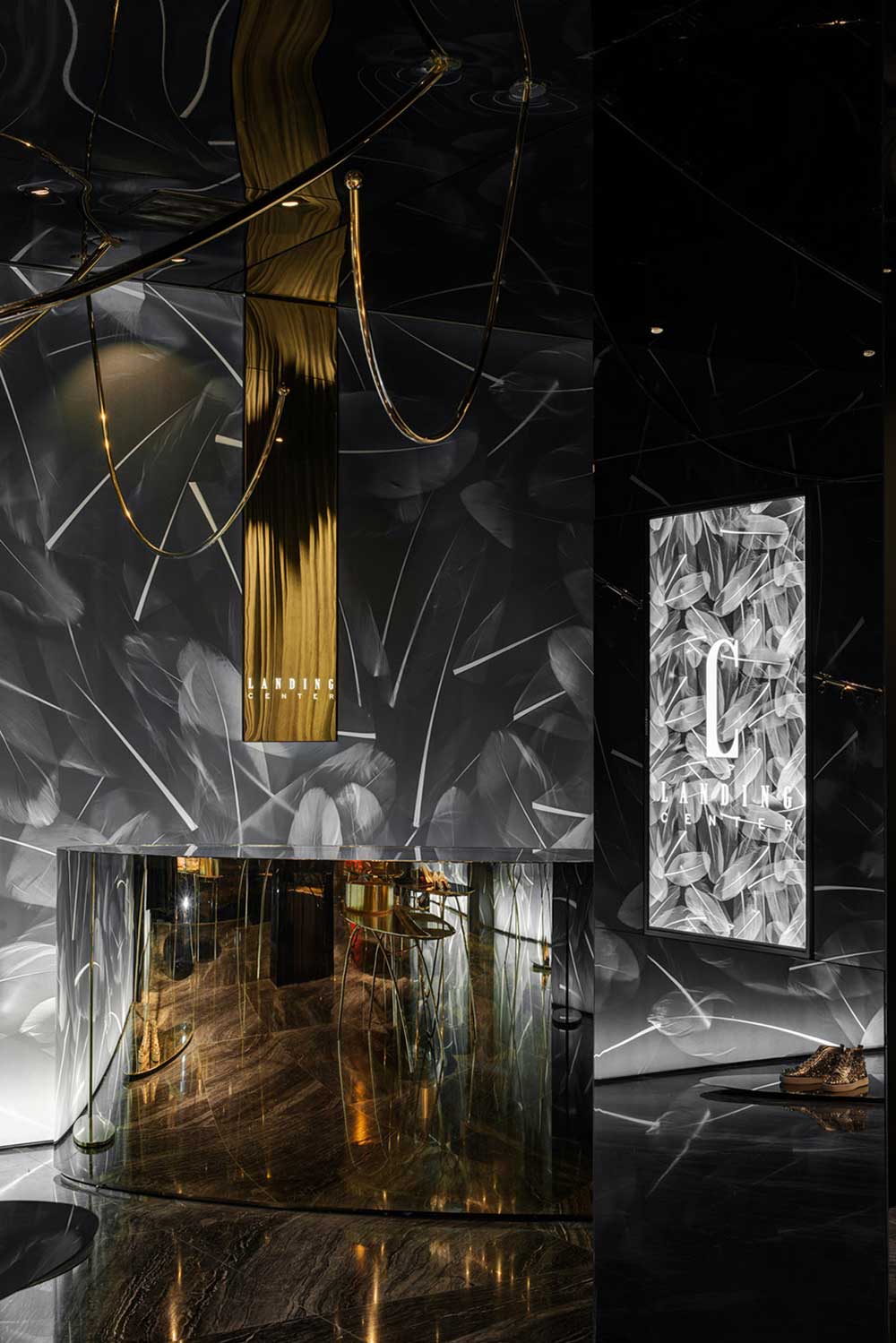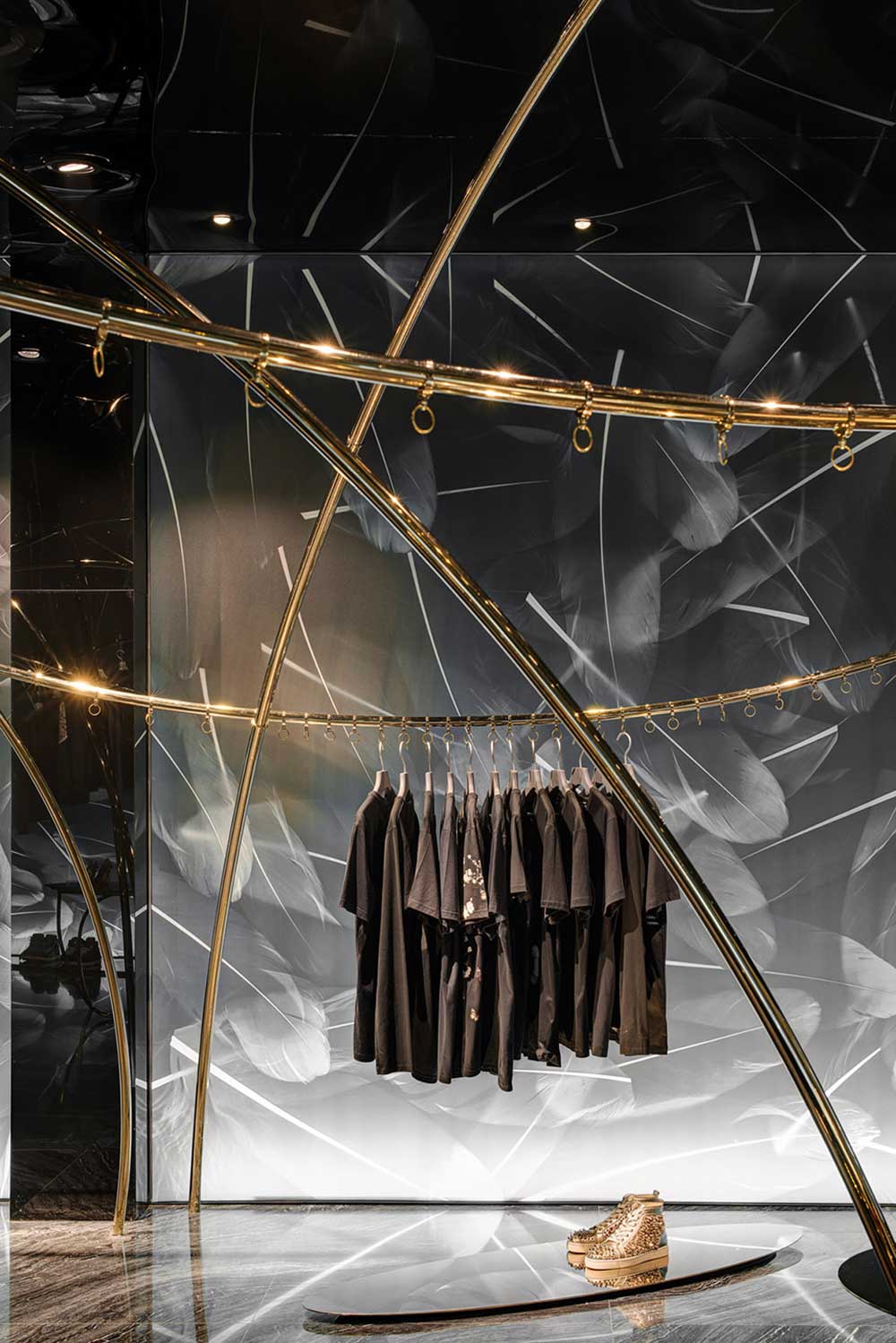 材料并非手段,可理解為達(dá)成的通道。商業(yè)攝影的介入讓羽毛圖形得以在透光軟膜上漾開(kāi),配合暗藏的燈光,制造引力反轉(zhuǎn)效果;兩種規(guī)格香檳金的鐵管,一為起點(diǎn)一為終點(diǎn),如白描的線(xiàn)條在空中隨性;黑色鏡面軟膜天花產(chǎn)生的屈光效果,把空間里的物品鏡化出了水墨畫(huà)的感覺(jué)。西方材料的東方表達(dá),是本案在材料運(yùn)用的主張。